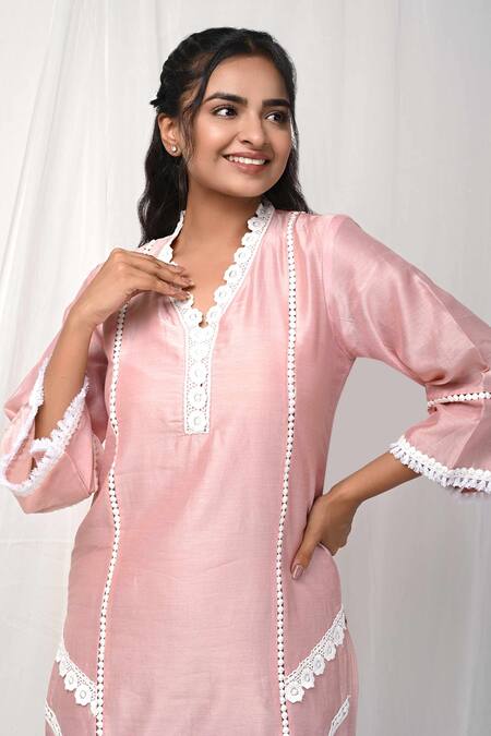 Peach kurta featuring floral lace detailing with three fourth flared sleeves. Paired with a matching pant embellished with floral lace.