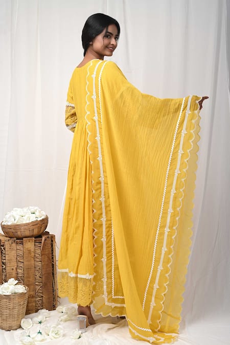 Yellow Anarkali featuring a V neckline, three fourth sleeves, and floral lace detailing on the yoke. Paired with a floral embroidered pant and lace embellished dupatta.