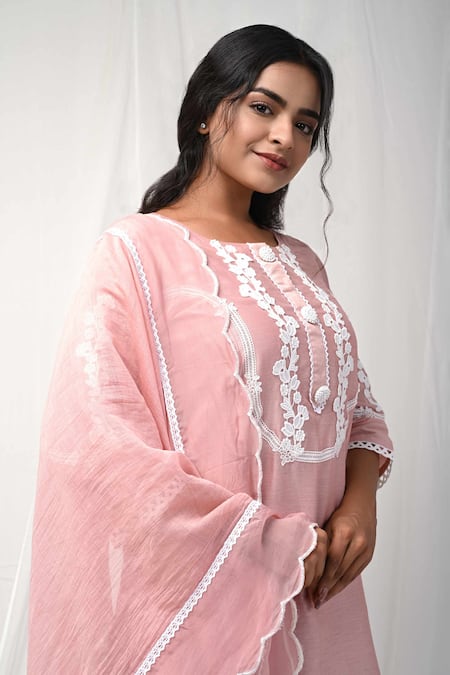 Peach Chanderi Lace, Embroidery Round Neck Florid Embellished Kurta Pant Set