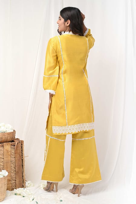 Yellow straight kurta featuring floral lace detailing on the yoke, hem & side panels. Paired with a pant embellished with flora blossom lace.