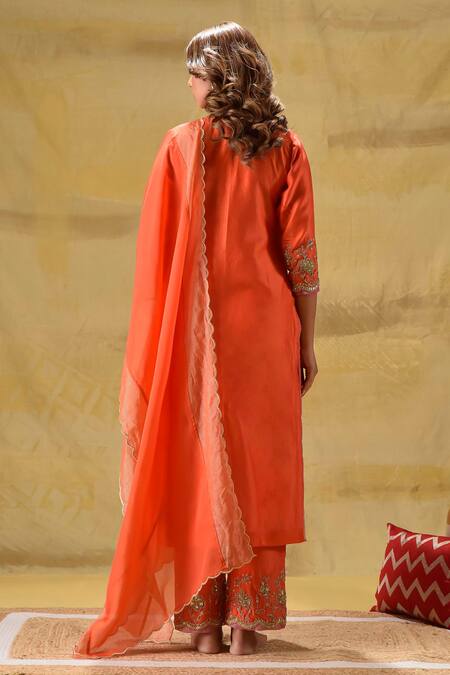 Buy_Gulabik Jaipur_Orange Chanderi, Organza Sequins, Embroidery, Zari Split Burnt Kurta Set_Online_at_Aza_Fashions