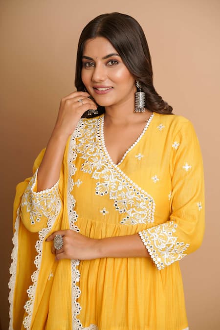Sunset yellow anarkali featuring three fourth sleeves and V neck. Paired with a lace embroidered hem pant and mirror lace border embellished dupatta.