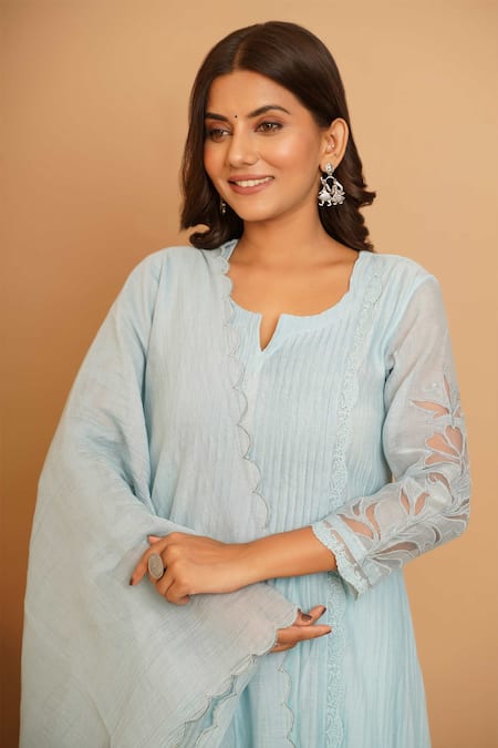 Blue Anarkali featuring three fourth sleeves, notched round neckline, and phool cutwork embroidery. Paired with scallop hem pant and floral cutwork embroidered dupatta.