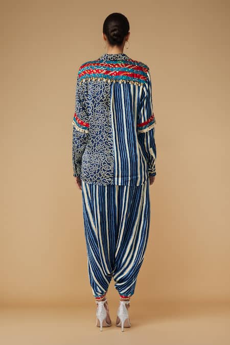 Blue full sleeves shirt featuring bandhani-striped print with ghungroos, coins & seashells embellishments. Paired with matching print harem pant adorned with similar embellishments.