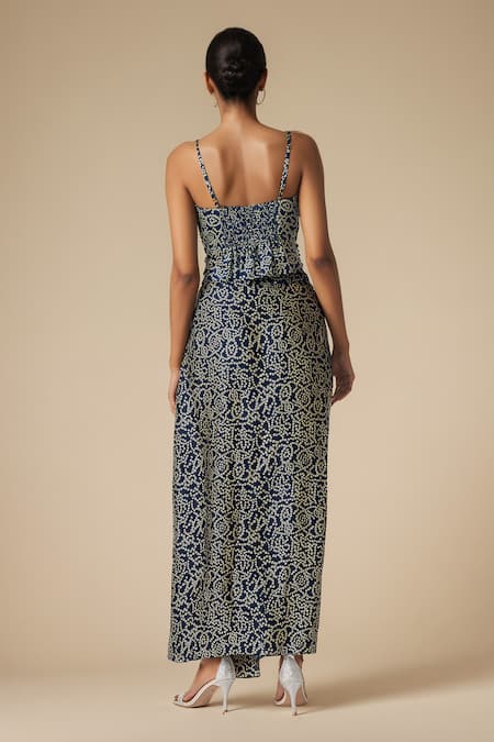 Blue draped skirt featuring bandhani print all over with leheriya detailing and a front slit