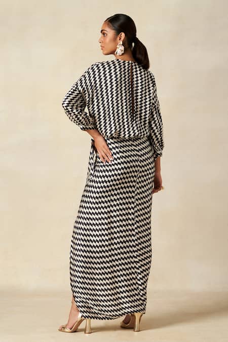 Black & white blouson top featuring an all-over checkerboard print and puffed sleeves