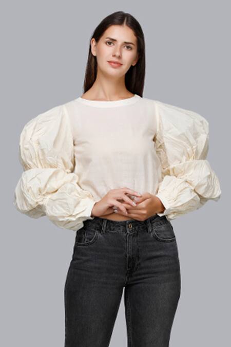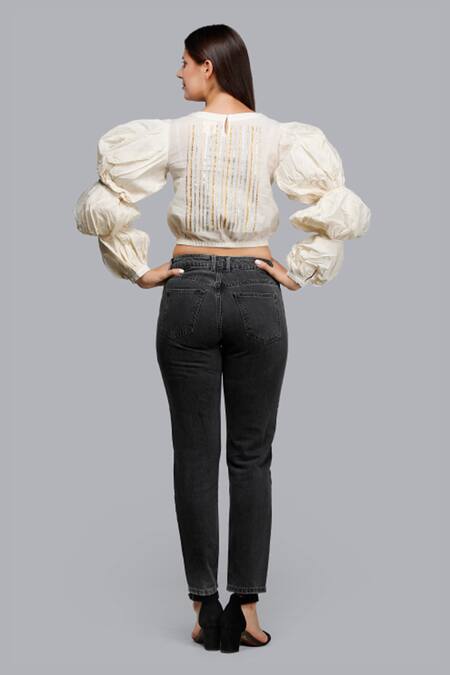 Off-white top with layered exaggerated bubble sleeves & placement dual-tone barcode motif gota work.