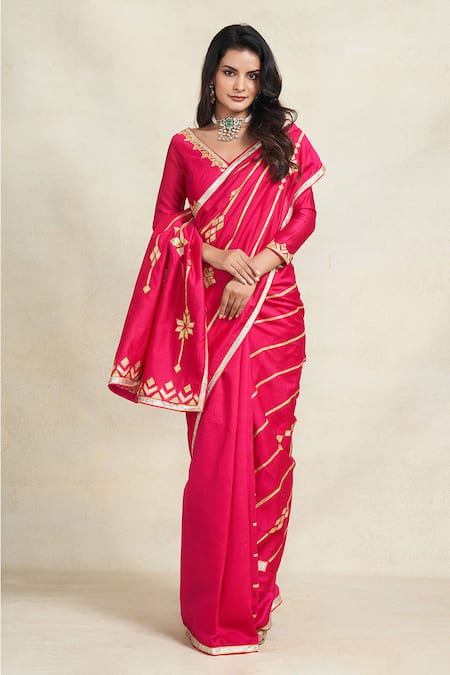 Rani pink chanderi saree featuring gota embroidery in a stripe pattern