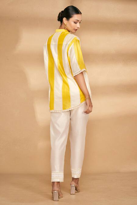 Yellow Chanderi Striped Mandarin Collar Pattern Shirt