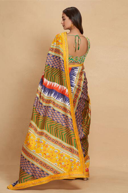 Multi colored blouse with chevron & abstract linear prints with multi colored embroidered hem & neckline.