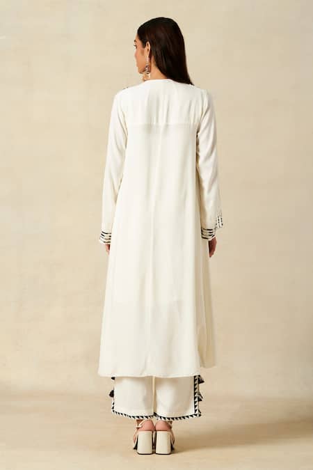 Off-white flared coat featuring mirror-like metallic applique work on the embroidered yoke and sleeves in a geometric pattern. Paired with an embroidered yoke tunic.
