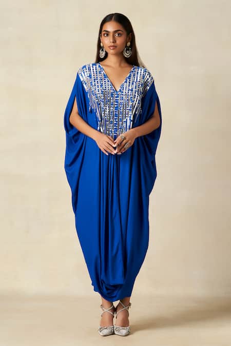 Royal blue cowl kaftan featuring a V-neckline and batwing sleeves
