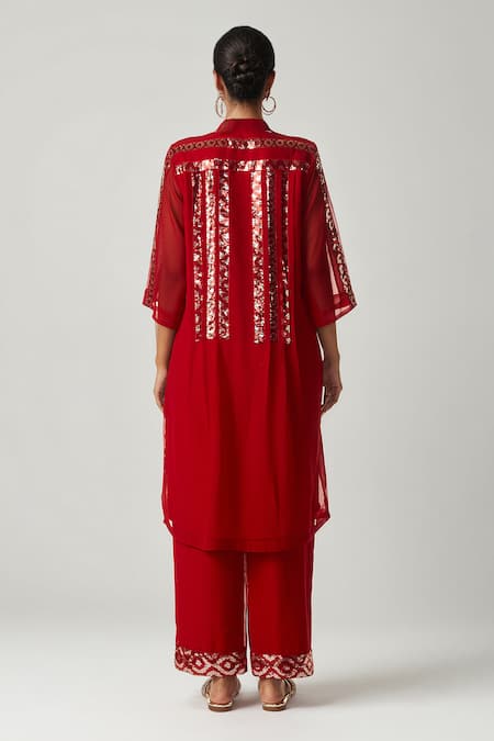 Red kurta featuring geometric sequin embellishments with pintucks in the front. Paired with embellished hem pants.