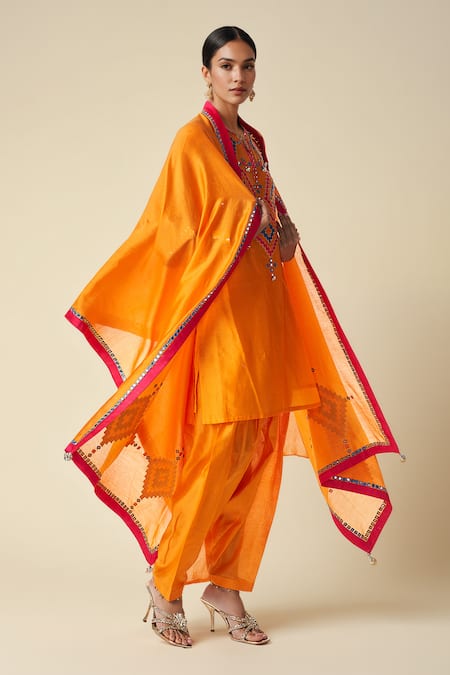 Mango orange dupatta featuring Ikat applique, abla mirror detailing, and ghungroos at the edges