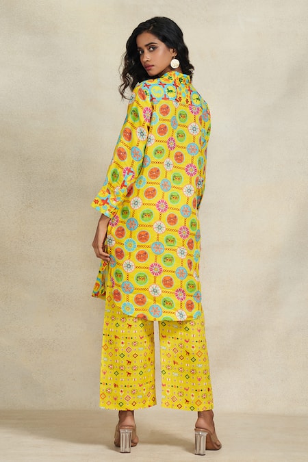 Yellow linen long shirt featuring animal and abstract floral geometric print, embellished by sequins