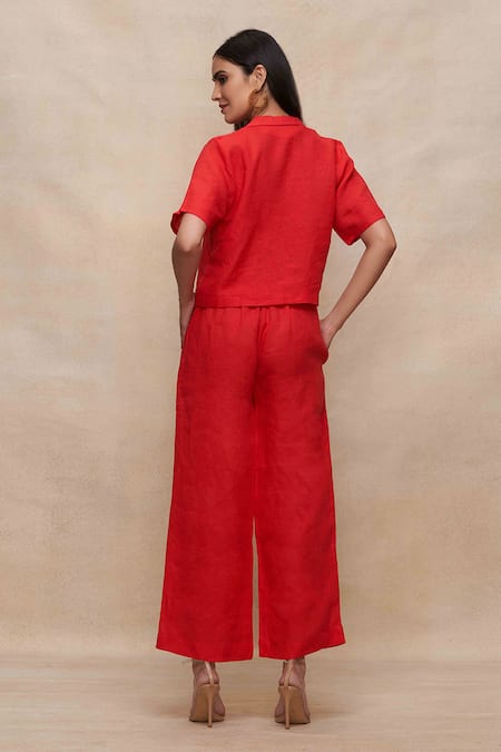 Red Linen Collared Cropped Shirt