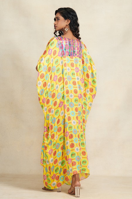 Yellow kaftan featuring a flared silhouette with digital prints of animals, abstract florals, and geometric patterns