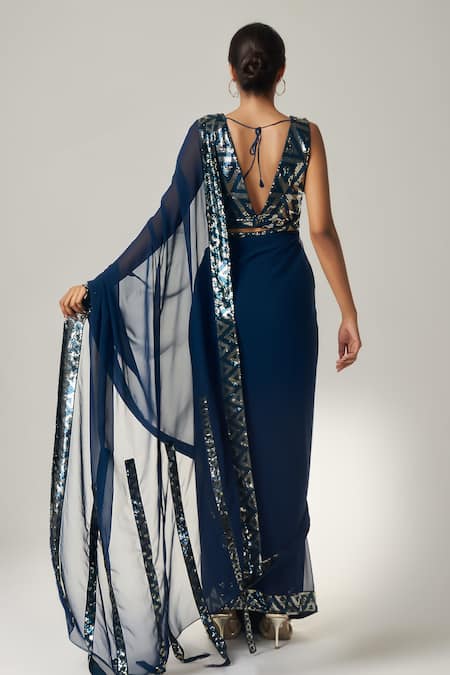 Buy_Gulabo By Abu Sandeep_Blue Viscose, Georgette Sequins Geometric Embellished Pre-draped Saree _Online_at_Aza_Fashions