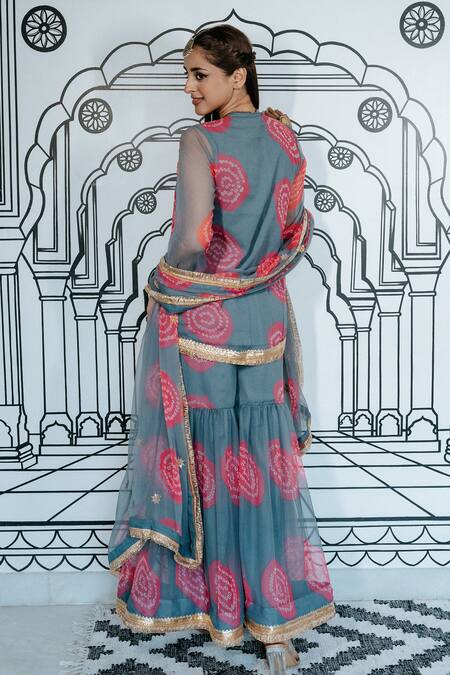 Grey kurta featuring a U neck, full sleeves, and intricate zardozi embroidery. Paired with a bandhani patterned sharara and a dupatta adorned with gota lace embellishments.