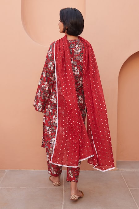 Red Cotton Embroidery Round Neck Anjum Straight Kurta Set