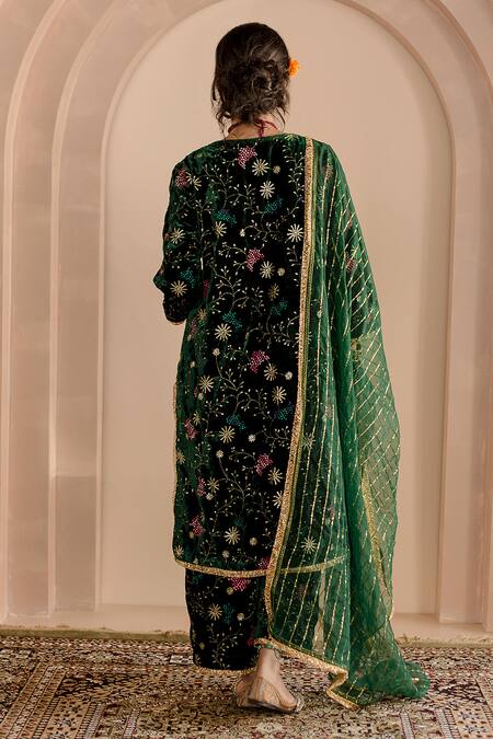 Green velvet kurta featuring resham thread embroidery and a leaf neck. Paired with matching pant and an organza dupatta.