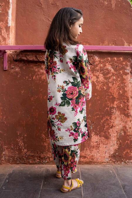 Off white kurta featuring floral hand block prints and side slits. Paired with a matching pyjama for a coordinated look.
