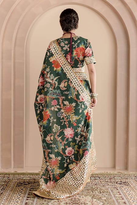 Green Cotton Embroidery V-neck Gulbaagh Floral Print Saree Set