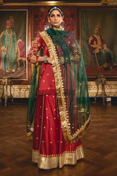 Maroon chanderi kurta featuring gota patti and zari embroidery in floral patterns. Paired with a matching sharara and a kiran lace bordered contrast sheer dupatta.