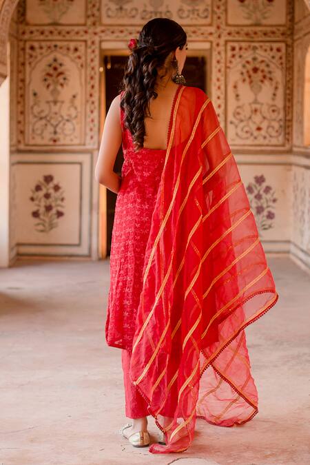 Red kurta featuring floral kadhai embroidery and a semi square neckline. Paired with a jaal pattern pant and a lace striped embellished dupatta.