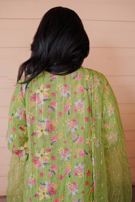 Green Muslin, Organza Embroidery, Lace Collared Meer Floral Print Kurta Pant Set