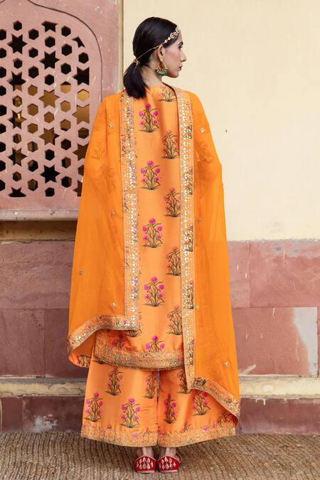 Orange Opada Silk Dupatta Chiffon Leaf Neck Mehreen Floral Print Kurta Set