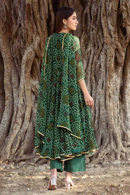 Green anarkali kurta with all-over multi-color jaal printed motifs & gota hem. Comes with pyjama & dupatta.