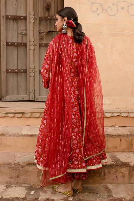 Red Anarkali featuring three-fourth flared sleeves and all-over botanic bloom handblock print with taari work embellishments. Paired with a matching straight pant and sequin jaal embroidered dupatta.