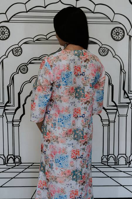 White kurta featuring threadwork floral motifs on a floral collage print base. Paired with matching printed pants.