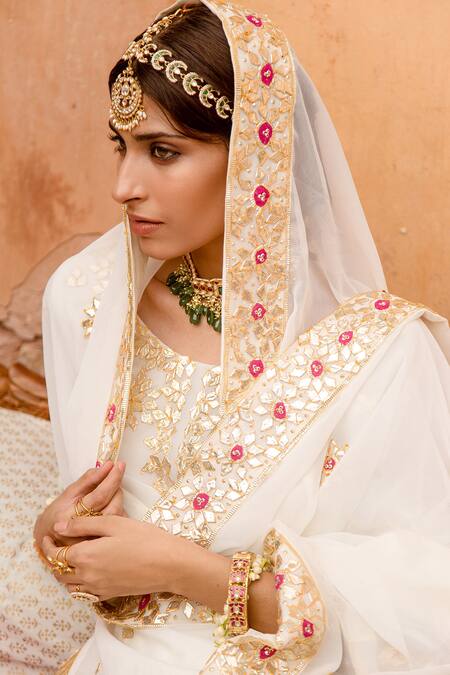 White lined short kurta with gota & floral embroidery. Paired with attached can-can embroidered lehenga & embroidered dupatta.