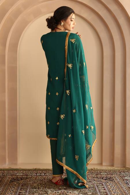 Green georgette straight kurta featuring gota patti embroidery. Paired with matching pant and dupatta.