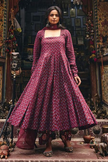 Wine printed Anarkali set made from soft cambric cotton. Set includes a matching printed pant and dupatta.