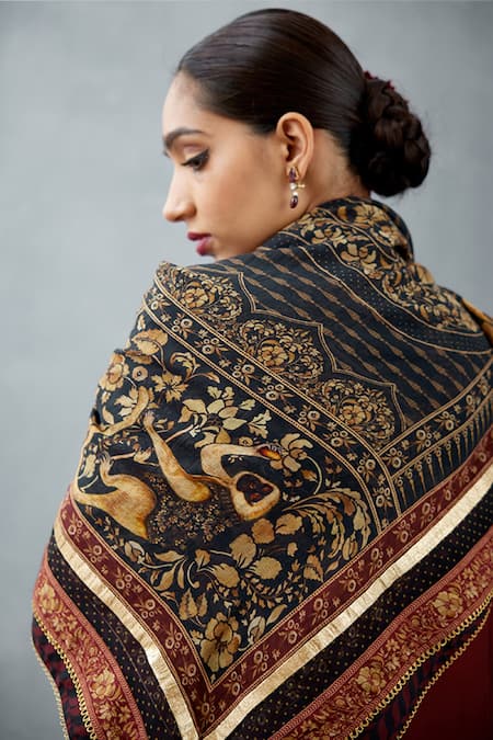 Black scarf featuring digital Bhagalpuri print with tassel details