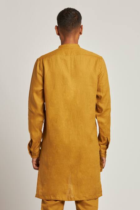 Yellow linen button down kurta with asymmetric high-low panel with pointed angular hem, band collar & full cuff sleeves.