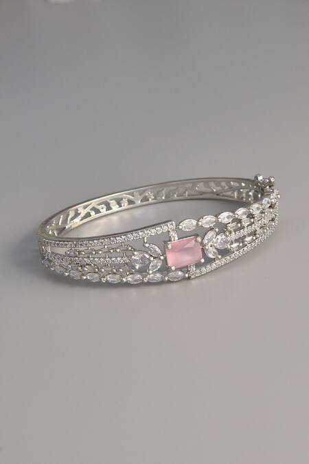 Pink bracelet featuring a leaf motif adorned with rose quartz and zirconia embellishments