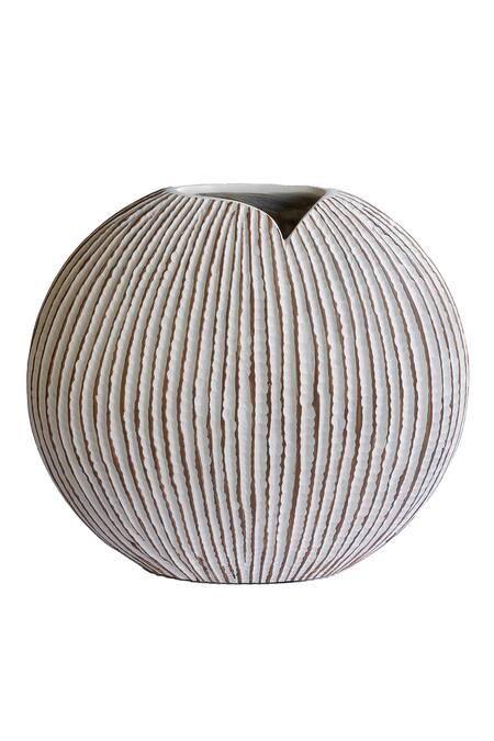 White flattened round vase crafted in polyresin, with a linear texture.