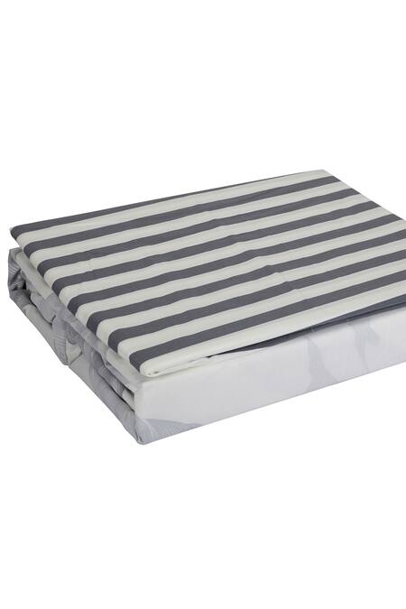 Off white bedsheet with pale grey feathers & black birds print. Comes with striped print two pillow covers.
