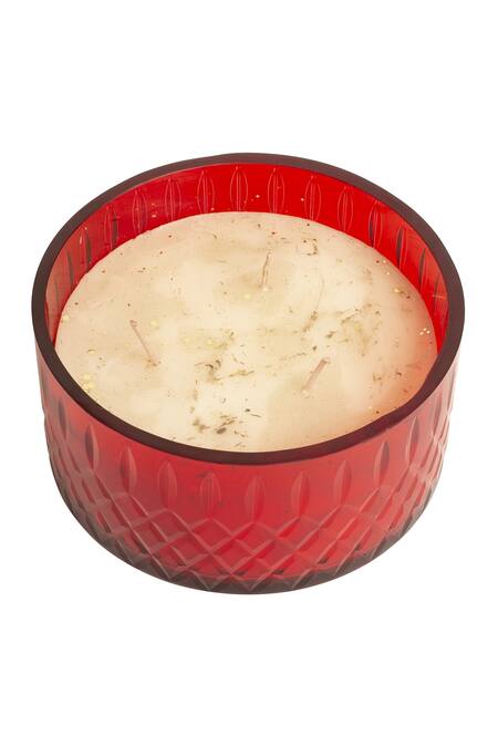 Red circular-shaped candle with engraved design and a multi wick jasmine scented wax.