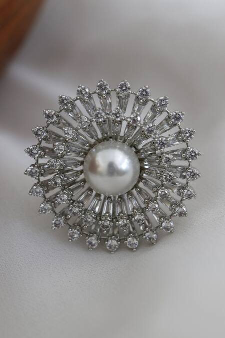 Silver toned rhodium plated ring with cubic zirconia embellishment and pearl in the centre.