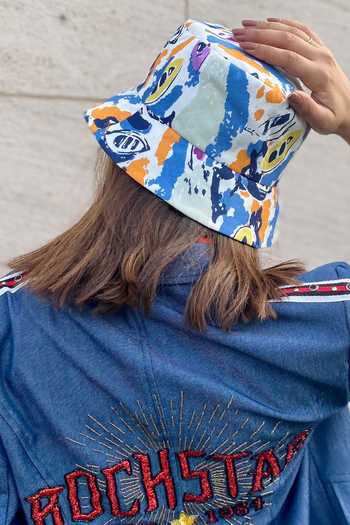 Blue, orange and white abstract print bucket hat.