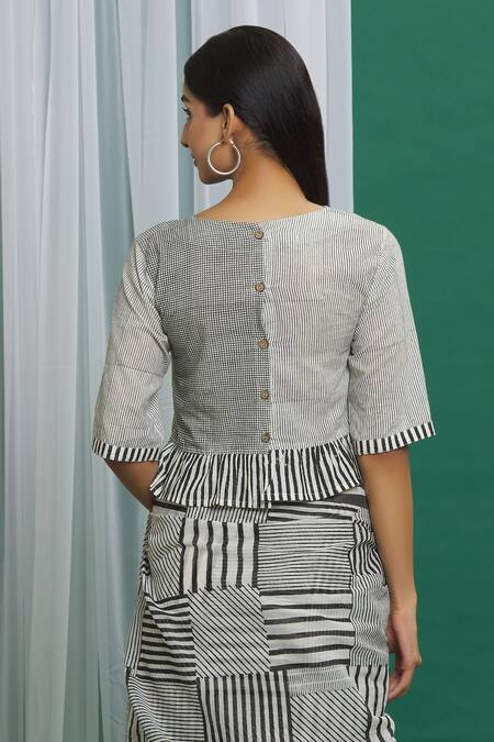 Black & white cotton handcrafted crop top with hand block printed stripes and checks.