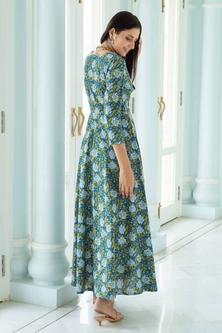 Buy_Rivaaj Clothing_Blue Hand Block Print Jacket And Kurta Set _at_Aza_Fashions
