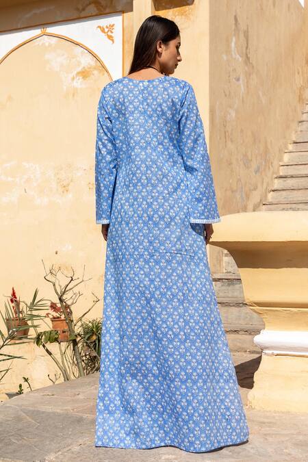 Blue Cotton Printed Block Round Notched Hand Kaftan