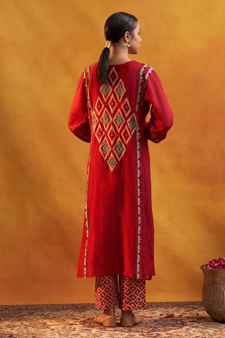 Buy_Rekha Agra_Red Kurta Chanderi, Pant Cotton Flex Geometric Hand Block Print And Set _Online_at_Aza_Fashions