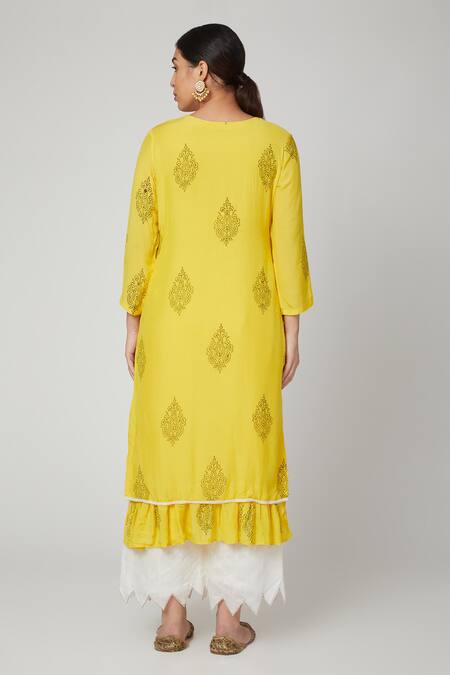 Mustard straight long kurta with hand block printed motifs & cutdana work in the yoke. Paired with ivory scallop pant and a organza dupatta.